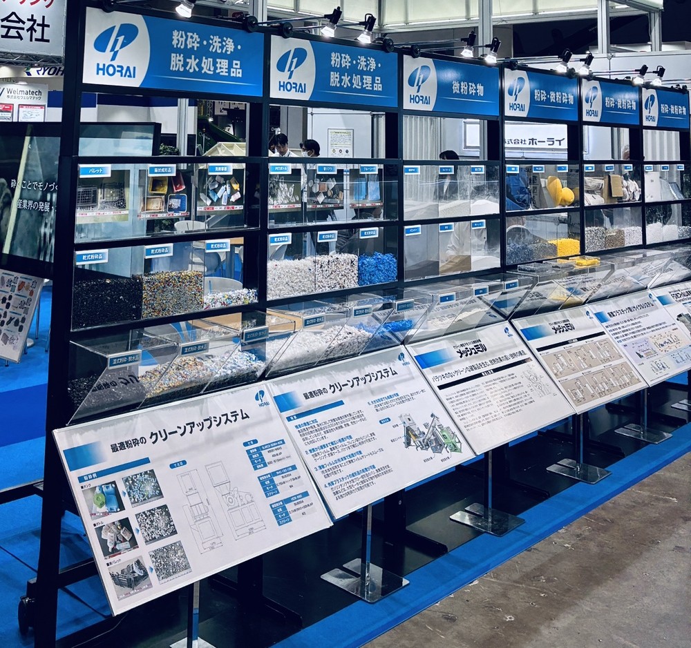 | 出展機 | 樹脂ダンゴブロック用粉砕機 DB-3048型 コンパクト二段破砕・粉砕機 KR-2060型 + XI-2060型 一軸式粉砕機 Z-562型 一軸式破砕機 EH-6090型 二軸式破砕機 KM-40100型 新型ボトル減容機 HSP-205E型 その他 破砕・粉砕各サンプルも多数展示 |